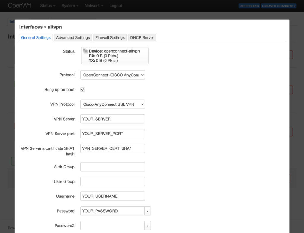 • VPN_SERVER_CERT_SHA1 — отпечаток SSL сертификата сервера (по умолчанию в прошивке OpenWRT отсутствует корневой сертификат центра сертификации, актуальный отпечаток SSL сертификата сервера можно найти в логах после неудачной попытки подключения к VPN серверу Status → System Log)