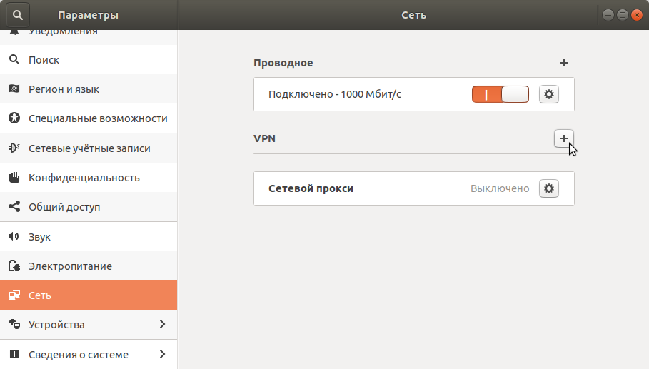 Добавляем новое VPN соединение. Для этого в открывшемся окне нажмите на «+» в разделе VPN